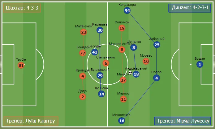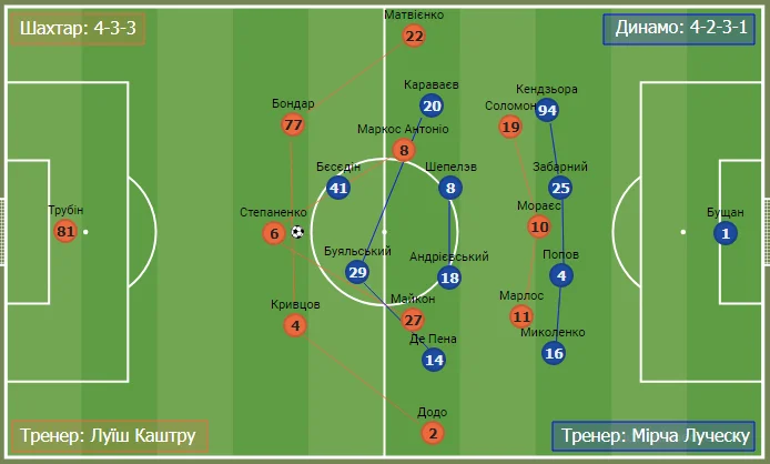 Динамо у деструктивній фазі трансформувалося у класичні 4-4-2. Буяльський складав пару з Бєсєдіним, а Караваєв та Де Пена сідали до рівня опорників.