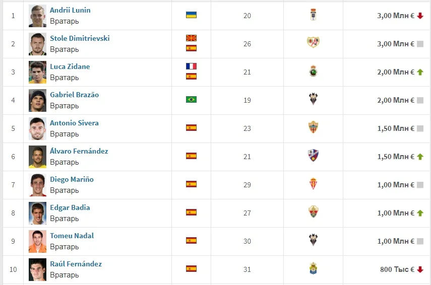 Українець ділить перший рядок із воротарем Райо Вальєкано Столе Дмітрієвскі – їхня трансферна вартість оцінюється у 3 мільйони євро. Відразу за ними йде Люка Зідан, який виступає за Расінг.