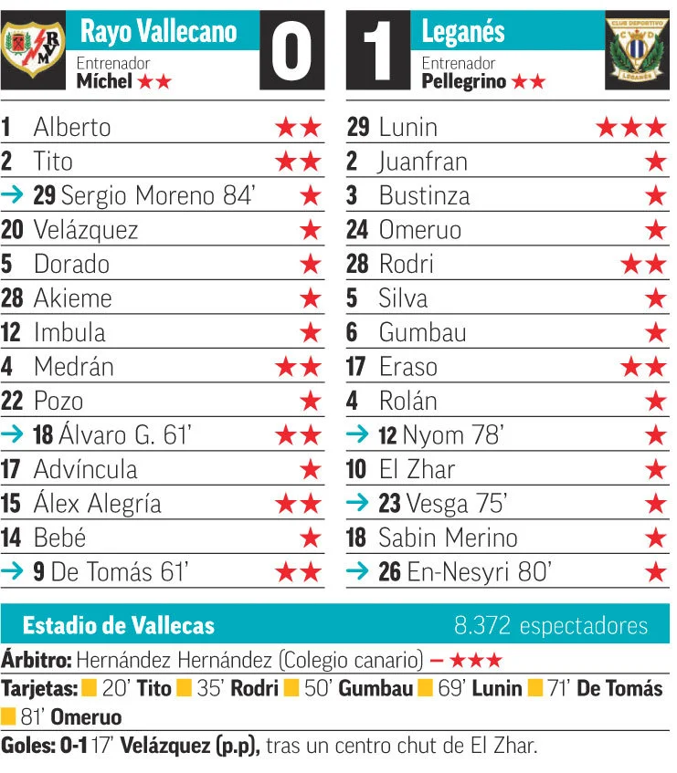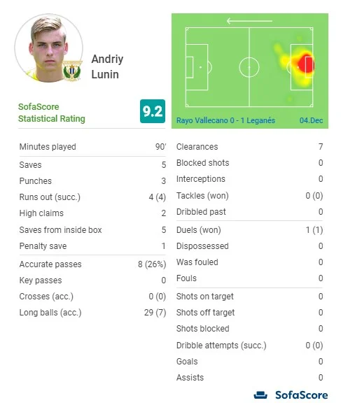 Зустріч на Кампо-де-Вальєкас стала бенефісом воротаря збірної України. Райо домінував на полі, маючи 73% володіння м'ячем, і завдав 16 ударів по воротах Леганеса. Працювати Луніну довелося дуже багато. Ще у першому таймі він виграв дві дуелі в Бебе (парирував удар з гри та взяв пенальті від екс-форварда МЮ), на старті другої половини зустрічі двічі за одну хвилину ліквідував серйозну загрозу у штрафному майданчику, а потім ще й під завісу матчу проявив свою реакцію.