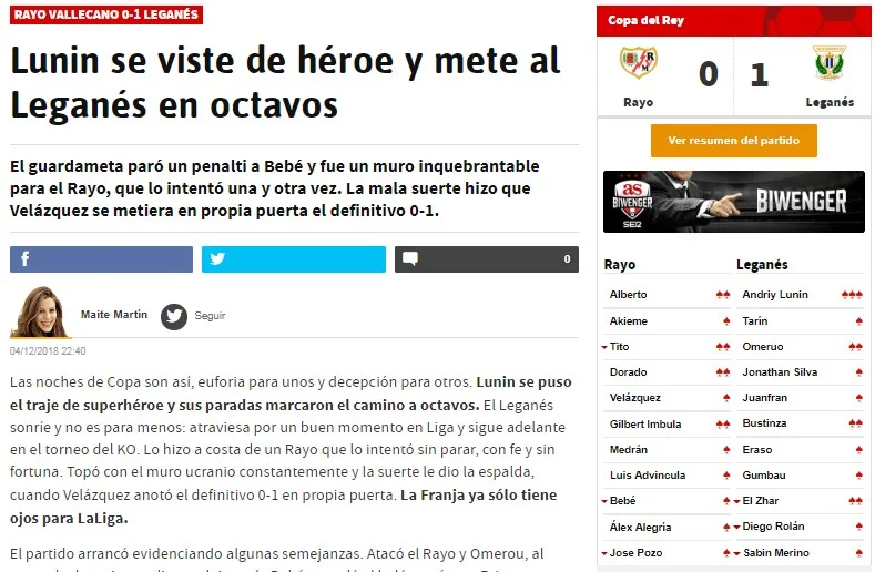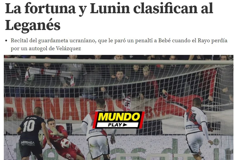 "Орендований у Реала Андрій Лунін став кубковим героєм Леганеса у Вальєкасі. Українець перевершив Нерео Шампань (який в минулому сезоні зупинив у Кубку Реал на Бернабеу) і показав Райо Вальєкано свої найкращі якості: тотальний спокій, реакція і відмінна збалансованість. Завдяки цьому він потягнув усе, що летіло від команди Мічела.