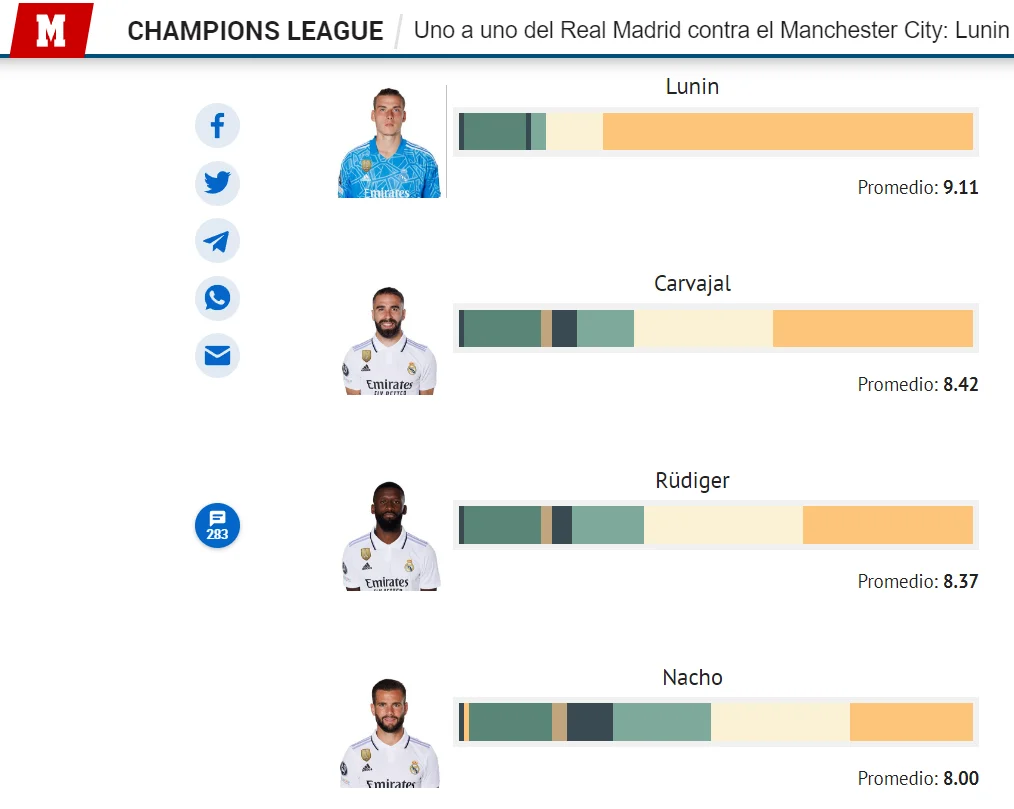 За свою гру українець був високо оцінений іспанською пресою. Від журналістів Marca Андрій отримав десятку, що є найвищою оцінкою. У голосуванні серед читачів видання він також був відзначений найвищим балом – 9,11. AS оцінив виступ Луніна на чотири по трибальній шкалі.