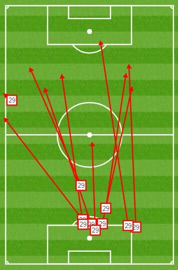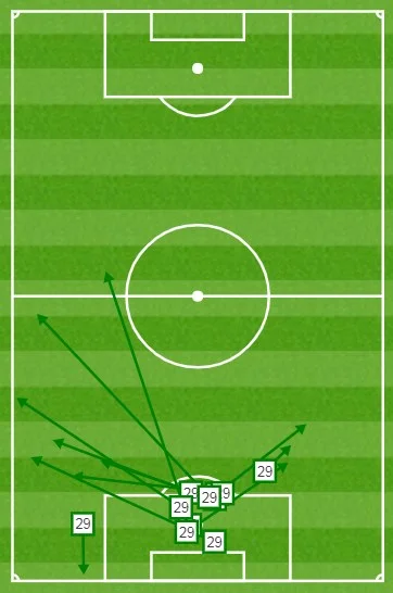Точність пасів у Луніна була посередньою – 55% (середня в Куельяра – 57%, в Куртуа – 77%). З карти передач 19-річного кіпера помітна закономірність:
