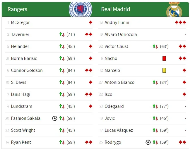У першому таймі Рейнджерс влаштував справжнє бомбардування володінь Луніна. Господарі завдали аж 13 (!) ударів по воротах українця, з 8-ма потрапляннями у площину. Наш кіпер крутився як білка в колесі, зрештою саме його блискуча реакція дозволила мадридцям зберегти ворота на замку після стартових 45 хвилин. Півзахисту Реала взагалі не існувало, а експериментальна оборона – Одріосола, Чуст, Начо, Марсело – відбивалася з великими труднощами.