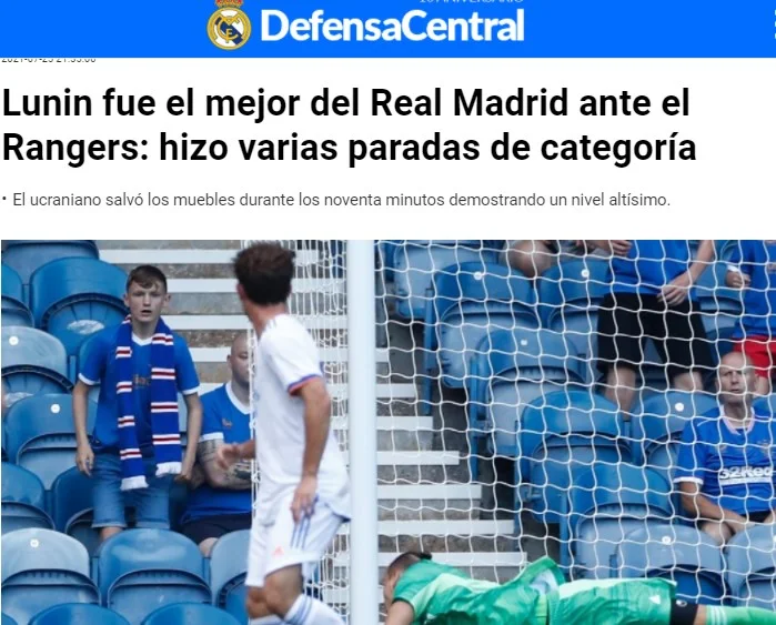 Defenca Central теж поставив Андрію найвищу оцінку (8), щоправда стільки ж отримав і Родріго – автор єдиного результативного удару у складі "бланкос". "Український воротар запобіг великому погрому. У нього не було жодних шансів під час гольових атак Рейнджерс. Його просто розстрілювали. Зате в першому таймі Лунін показав справжній клас, три сейви найвищого ґатунку. Саме завдяки надійній грі свого кіпера Мадрид уникнув побиття. Без сумніву, разом з Родріго, це найкращий гравець "бланкос".