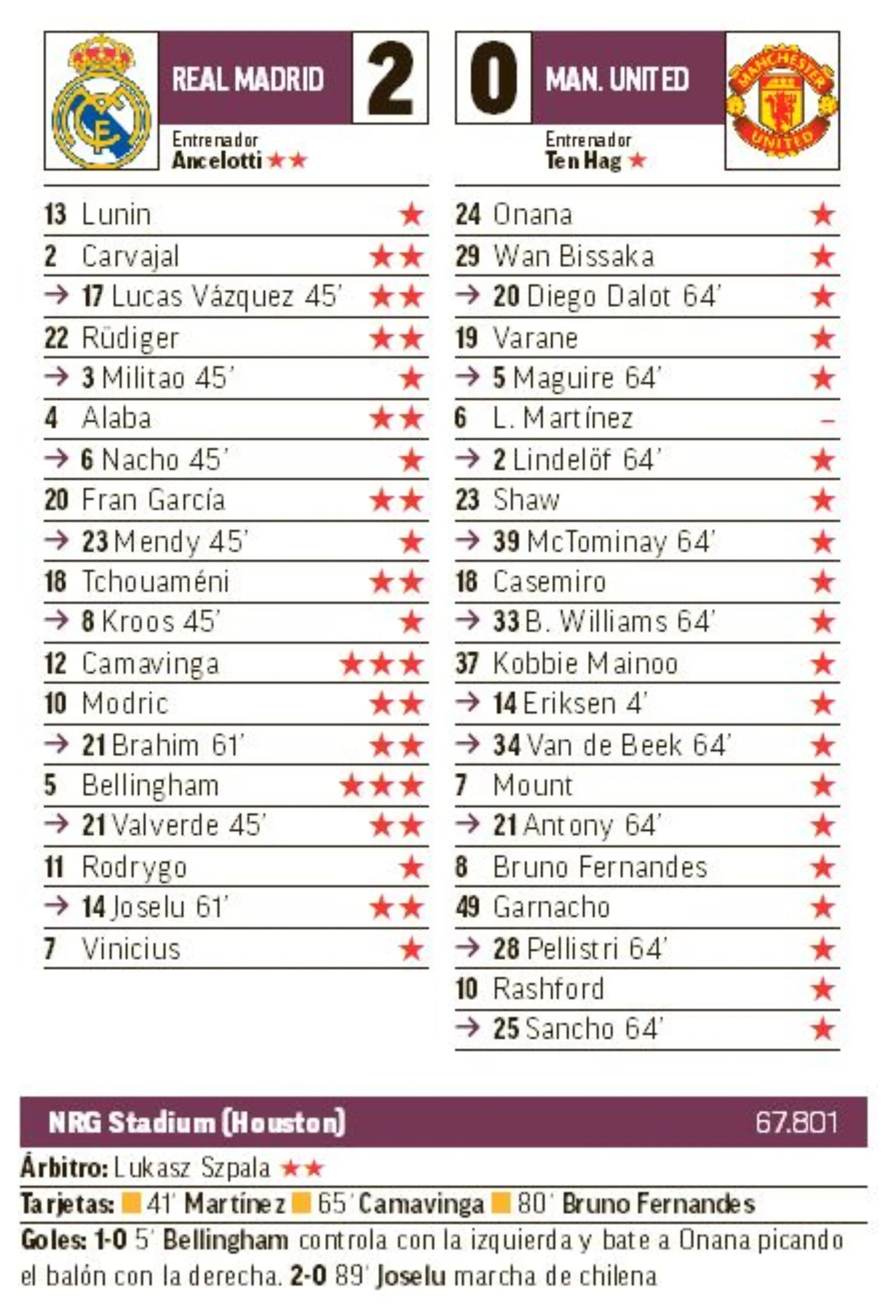 Сайт прихильників Реала Defensa Central поставив Луніну третю найвищу оцінку – 8. Попереду лише містер-бісіклета Хоселу (10), вже згаданий Беллінгем, Камавінга і Чуамені (в усіх – по 9). “Дуже хороша гра від резервного воротаря. Виглядав впевнено і виконав кілька гарних сейвів”. Цікаво, що після Мілана DC принизив Андрія жахливою четвіркою.