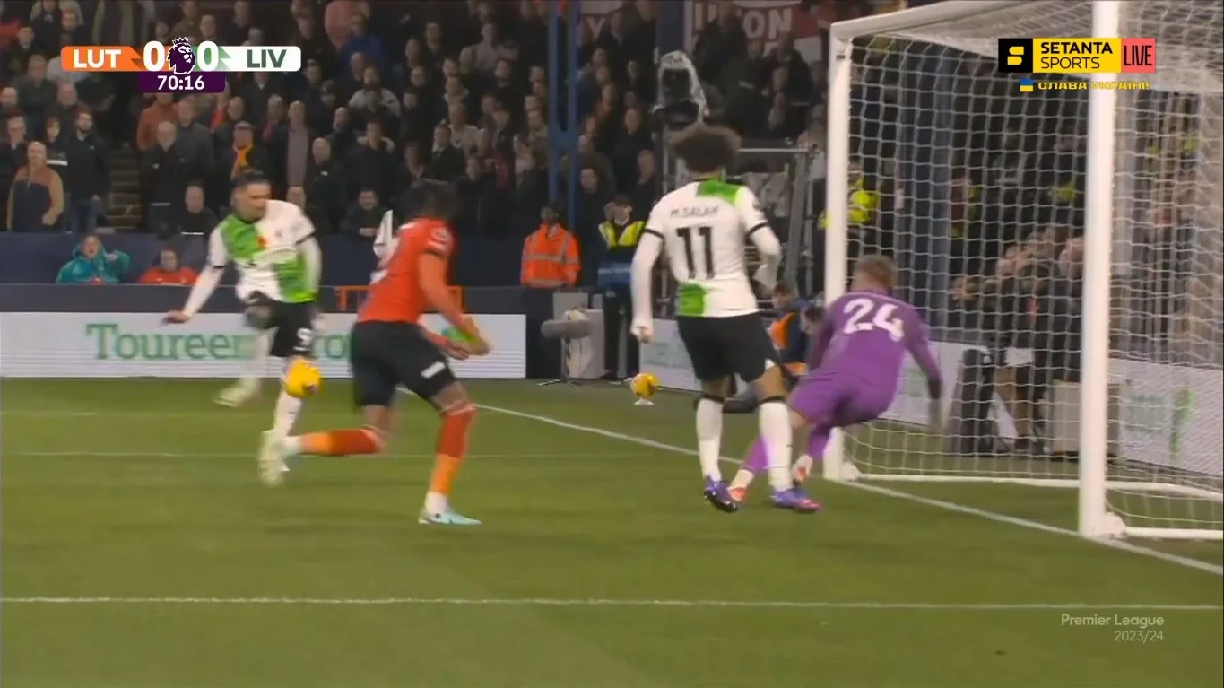 Салах створив момент для уругвайського одноклубника, а згодом зовсім вільний підібрав снаряд у штрафному, але бахнув дуже високо. Лутон видав 3 ударні вилазки. Як тільки є можливість розігнати контру, господарі роблять це, не соромлячись заходити у штрафний і бити звідти. З особливою охотою цілять у фланг Александера-Арнольда, який міг забивати здалеку і вже створив 2 чудові нагоди для партнерів. Кабору щуриться – влучив м'яч у голову, певний шок передживі захисник Лутона. Барклі виставленою долонею дав по обличчю Мак Аллістеру, страждання чемпіона світу суддя не оцінив.