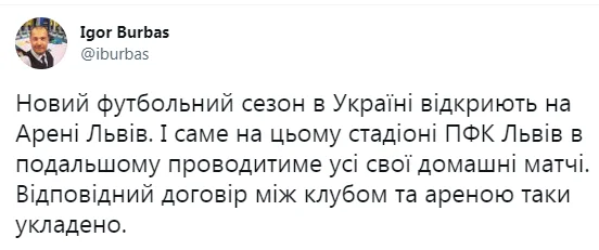 Відповідний договір між клубом та ареною таки укладено", – написав Бурбас на своїй сторінці у соціальній мережі Твіттер.