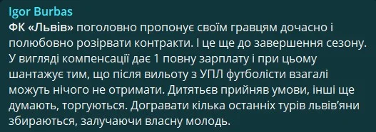 Боси ФК Львів пропонують усім гравцям команди полюбовно розірвати контракти до завершення сезону, повідомляє журналіст Ігор Бурбас.