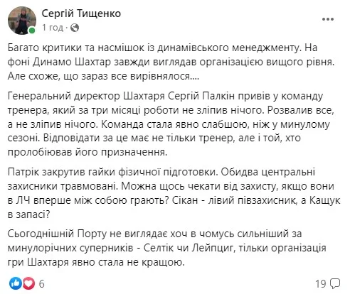 Сергій Тищенко, автор Футбол 24, розставив наголоси таким чином: 1) Йовічевіч такому супернику точно б не програв; 2) головні винуватці – Палкін та ван Леувен; 3) Шахтар зараз у ролі Динамо.