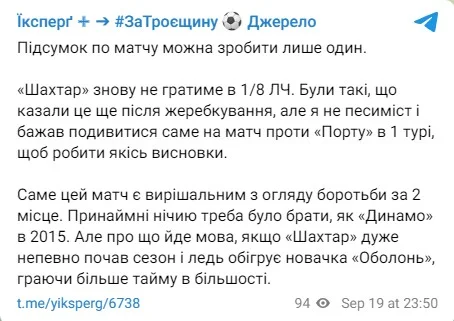 У підсумку, тг-канал Їксперг вже поховав шанси Шахтаря на плей-офф ЛЧ.