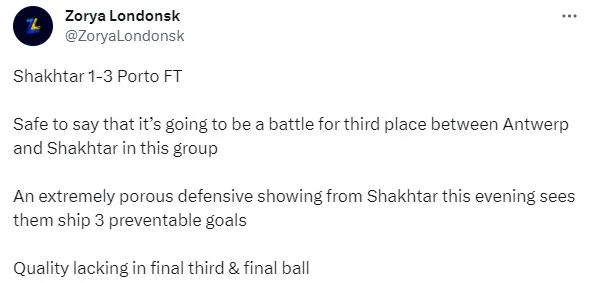 Ендрю Тодос (Zorya Londonsk) теж вважає, що максимум команди ван Леувена – Ліга Європи. "Впевнено можна сказати, що між Антверпеном і Шахтарем буде боротьба за третє місце у цій групі", – пише він зокрема.