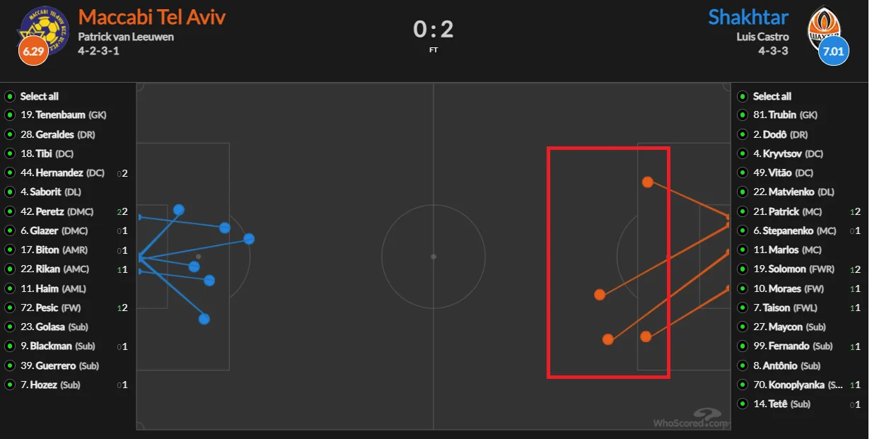 Шахтар вміло користувався наданим простором. Показовою стала статистика обіграшів на дриблінгу та карта вдалих спроб: донеччани 39 разів йшли у обводку – 18 разів успішно. В УПЛ стільки ж Шахтар може зробити за три-чотири зустрічі. І це при тому, що Маккабі непогано оборонявся, зробивши аж 27 відбирань, 15 виносів та 14 перехоплень. Тобто, навіть такі зусилля не врятували від видатного перформансу "гірників".