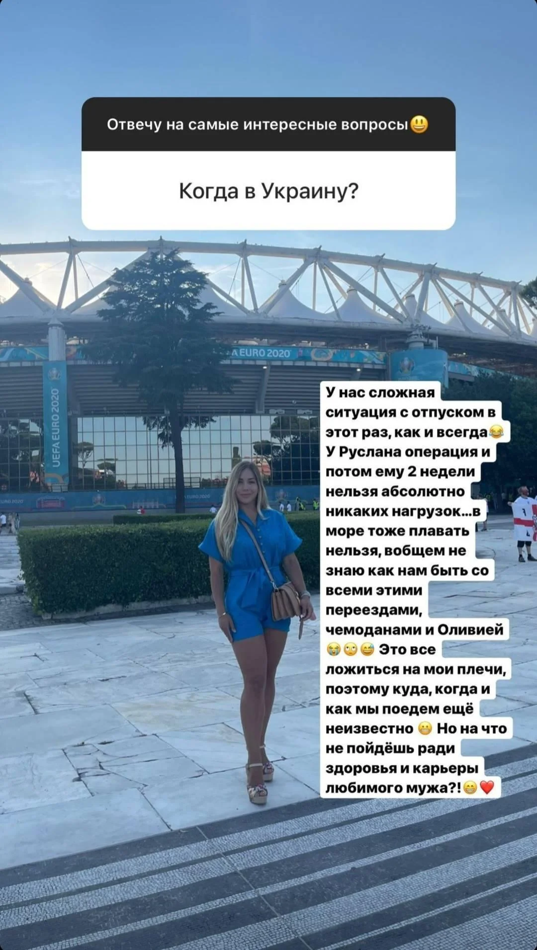 "У нас складна ситуація з відпусткою цього разу, як і завжди. У Руслана операція, і потім йому 2 тижні не можна абсолютно ніяких навантажень...