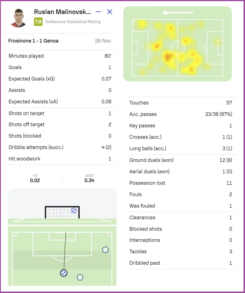 Окрім гола, українець також влучив у каркас воріт, віддав один пас під удар і двічі вдало пішов у дриблінг. Маліновський виграв 50% дуелей і тричі вступав у відбір.