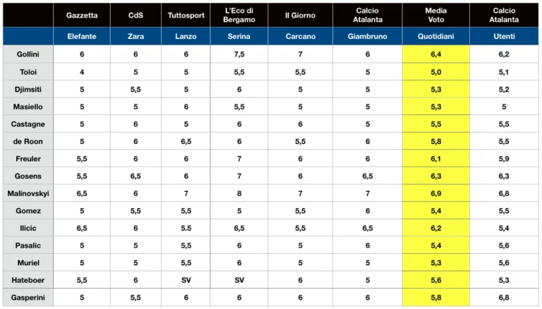 Нижче 6,5 півзахисник збірної України отримав лише від Фуріо Зари з Corriere dello Sport, якого у 2000-х кілька разів визнавали найкращим спортивним журналістом Італії. Автор низки книг про футбол вважає, що Руслан заслужив вищого балу, ніж головний тренер, але нижчого, ніж фланговий захисник Госенс. За версією La Gazzetta dello Sport, Маліновський став найкращим поруч з Ілічічем (по 6,5). Tuttosport навіть помістив його на обкладинку, вивівши в одноосібні лідери (7). L'Eco di Bergamo і взагалі оцінив на розкішні 8 балів. Від Il Giorno та CalcioAtalanta також сімка і місце на вершині командного рейтингу.