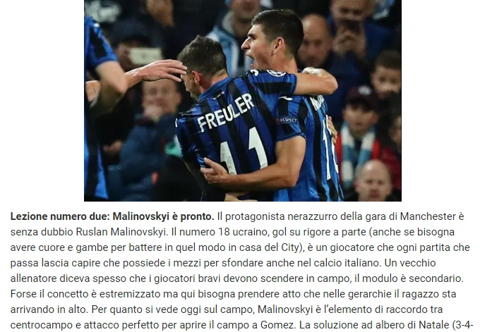 В іншому матеріалі LGdS пише: "Маліновський дав ілюзію Аталанті, але після цього Манчестер Сіті проїхався по ній катком. Протягом півгодини команда дозволяла тіфозі мріяти, граючи на рівних. Однак Давид може перемагати Голіафа раз на століття. Сіті зіграв без чистих центральних захисників, Аталанта – без провідного форварда". Видання відзначає холоднокровність Маліновського, якому вперше довірили пробити пенальті. Аталанта досить довго грала добре: без страху, з порядком, приймаючи виклик відкритої гри. Підсумок виявився таким, як і очікували, хоча бергамаски заслужили забити бодай ще один гол, зігравши у хоробрий футбол.