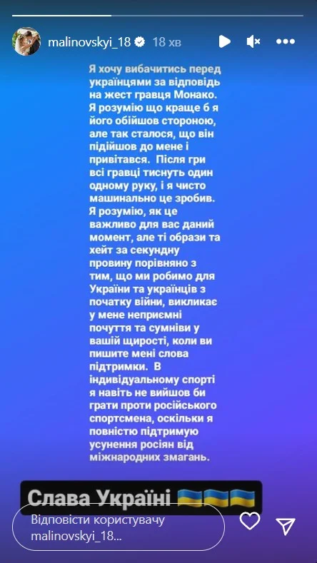 В індивідуальному виді спорту я навіть не вийшов би грати проти російського спортсмена, оскільки я повністю підтримую усунення росіян від міжнародних змагань", – написав Маліновський в Instagram.