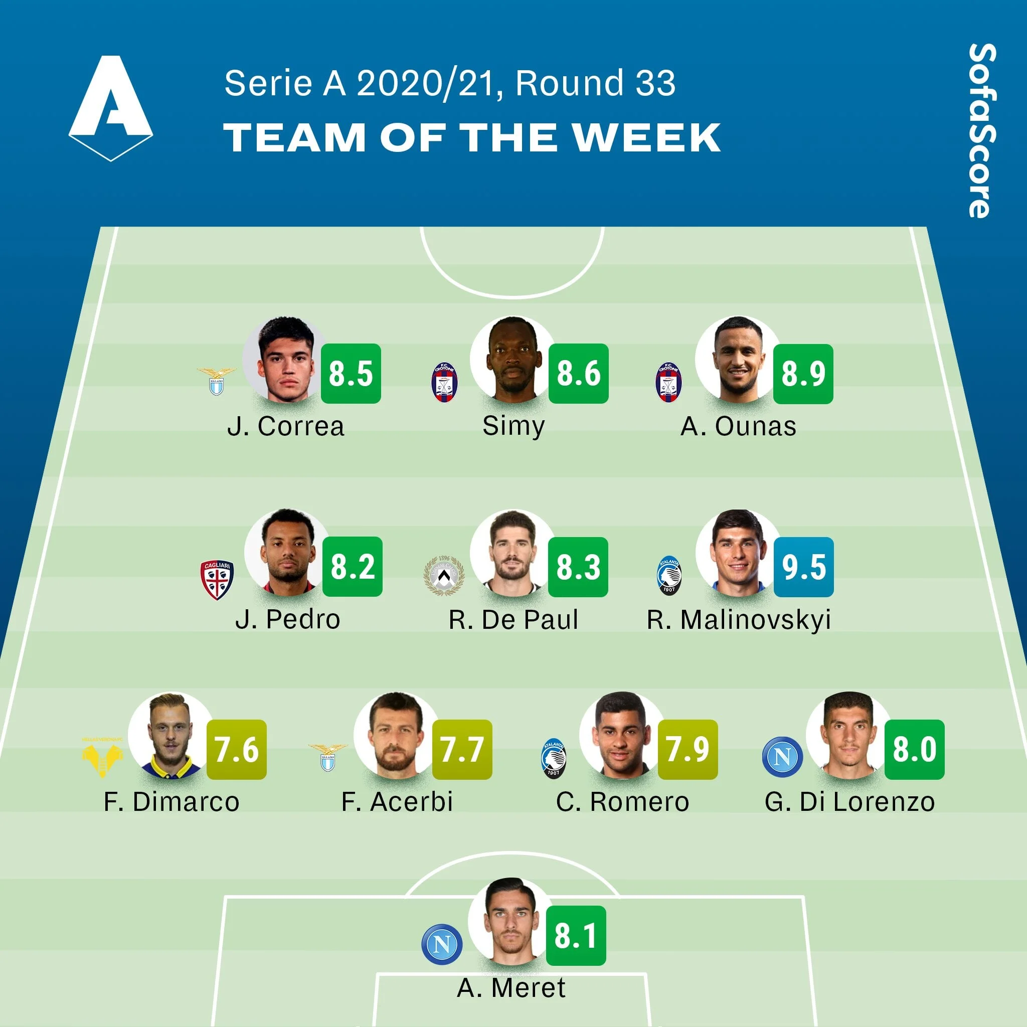 За підсумками 33-го туру італійської першості українець увійшов в одинадцятку найкращих за версіями WhoScored та SofaScore.