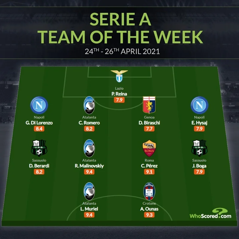 Маліновський відзначився асистом та голом у поєдинку проти Болоньї, який завершився погромом 5:0. За це він і отримав найвищі оцінки від SofaScore (9,5) та WhoScored (9,4). За версією останнього ресурсу Муріель має стільки ж та ділить першу сходинку з українцем.