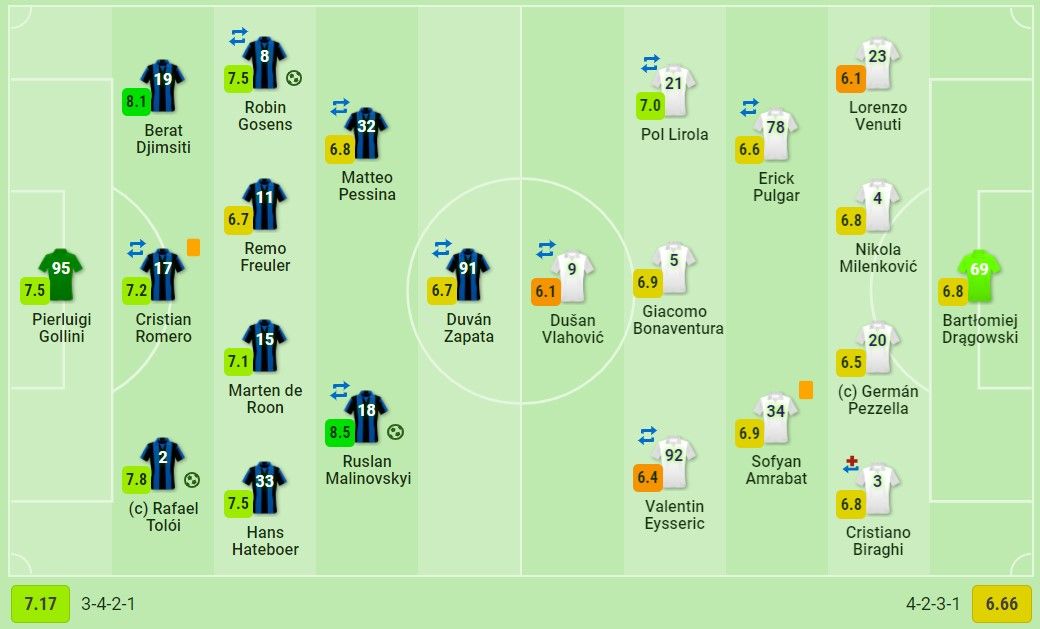 Сьогодні капітан Аталанти залишився в запасі, а замість нього в стартовому складі вперше після подолання коронавірусу з'явився Руслан Маліновський. Українець вийшов справа в атаці поруч з Сапатою. Наслідки хвороби у його діях не помічалися. Руслан грав у звичному стилі, роздавав передачі, відпрацьовував назад після помилок.