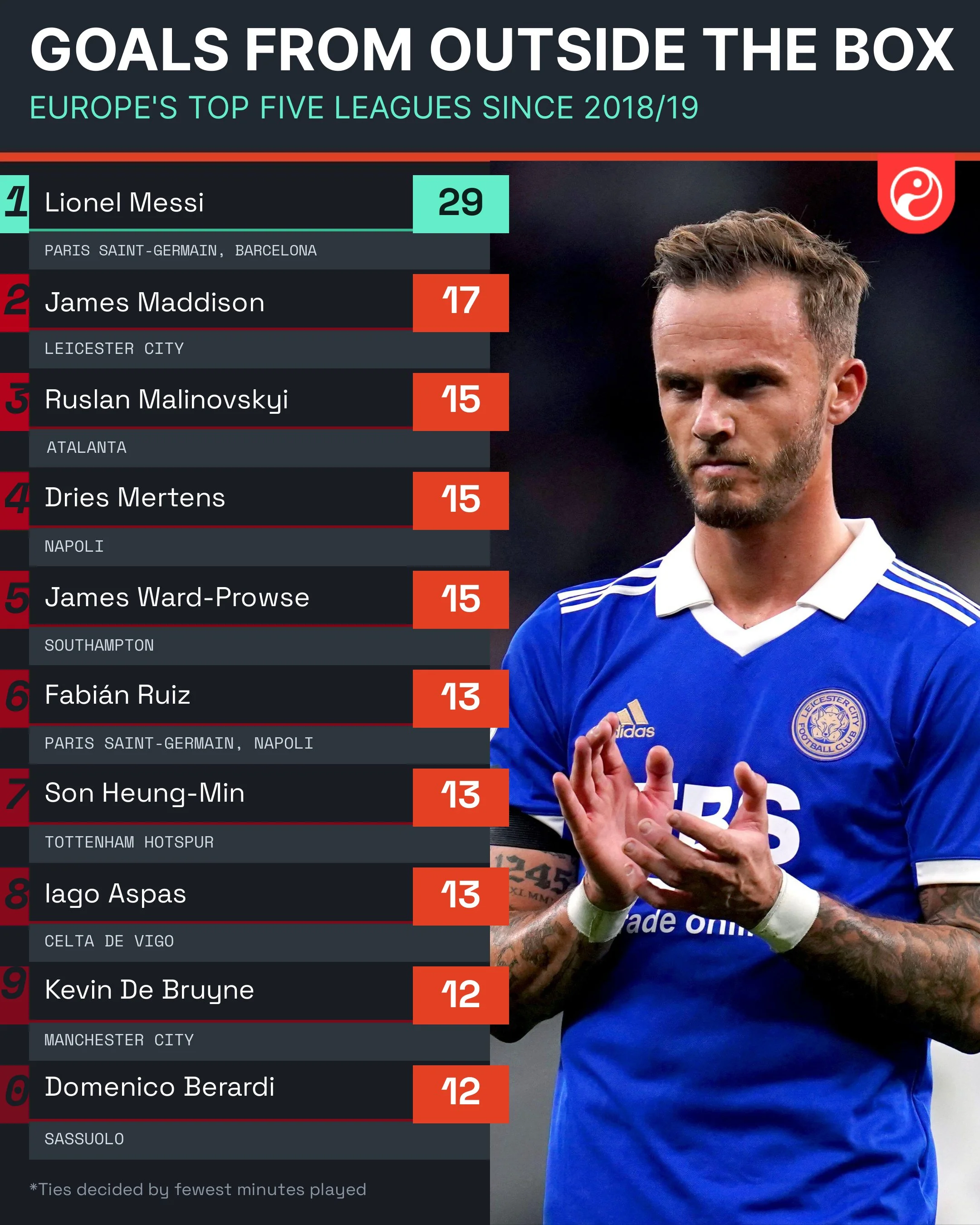 Зниженням результативності українця скористався Джеймс Меддісон із Лестер Сіті, який випередив Маліновського у рейтингу топ-5 чемпіонатів Європи за кількістю голів, забитих з-за меж штрафного майданчика.