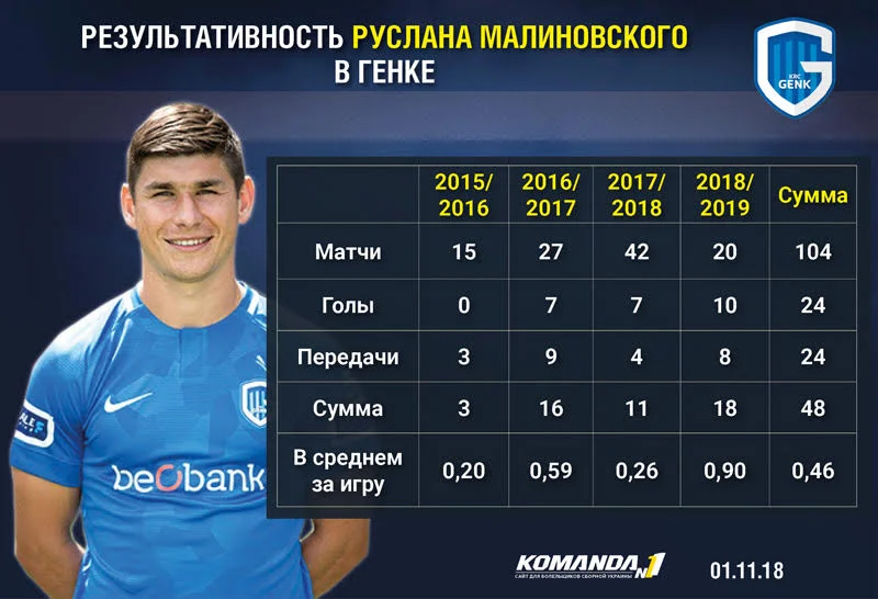 За 20 матчів, які українець провів у цьому сезоні за Генк, Маліновський зміг забити 10 голів та віддати 8 результативних передач, що робить цей сезон найкращим за результативністю для хавбека у бельгійському етапі кар’єри.