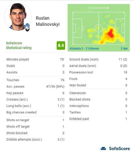 Очевидно, що Маліновський отримав схвальні відгуки та високі оцінки за свою гру. Невдалі результати збірної України у березневих матчах не знітили Руслана, який провів черговий класний поєдинок в Італії, відігравши 78 хвилин. 8.4 від Sofa Score – другий найкращий бал у матчі після Луїса Мурієля, який забив два голи. Високі 84% точності пасів, 6 ключових передач та "асистентський дубль" – вчора українець продемонстрував топ-клас в атаці. Але відзначимо і певний негатив – 18 втрат м'яча (найбільше в команді разом з Мурієлем, який відіграв на півгодини менше) та катастрофа у єдиноборствах (два виграних з одинадцяти). Імовірно, такі низькі показники пов'язані з певною втомою Руслана, який провів четвертий матч за 10 днів. Але в атаці свою справу уродженець Житомира зробив топово.