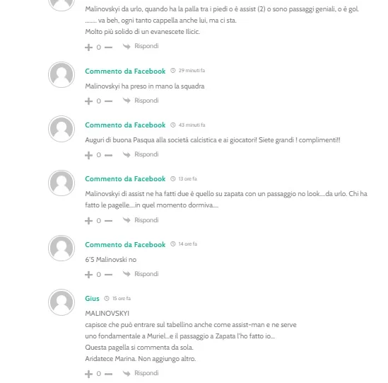 Профільний CalcioAtalanta оцінив Руслана в 6.5 – четвертий бал у складі Аталанти. "Опоненти, як могли, намагалися обмежити йому простір для удару, хоча одного разу він все ж небезпечно пробив. Але Маліновський вчасно зрозумів, що може увійти у протокол в статусі асистента, а Мурієлю потрібна передача", – підсумовує Альберто Джамбруно гру українця. Щоправда, така оцінка обурила читачів сайту. "Хто складав цей рейтинг? Маліновський віддав два асисти. Автор у той момент, напевне, спав". "Маліновський оформив розкішні асисти. Він куди кращий за Ілічіча", "Його здібності були відомі давно, але саме зараз Маліновський приймає найкращі рішення", – вболівальники Аталанти були здивовані такими оцінками.