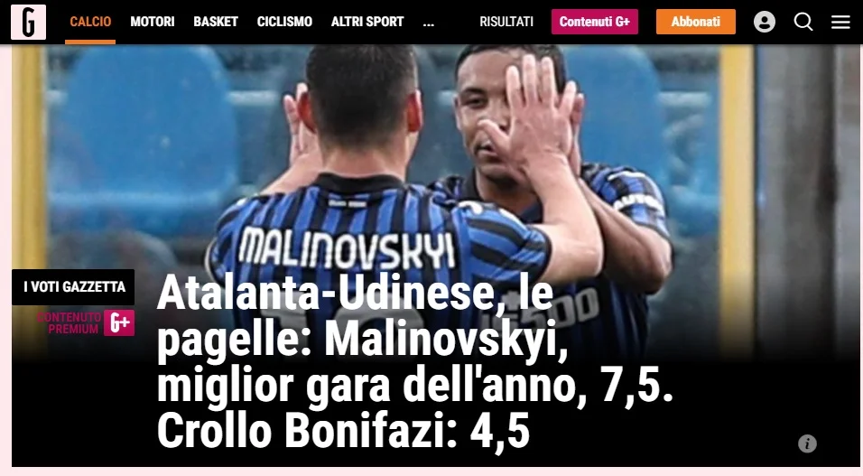 Таку ж оцінку (7.5) Маліновський отримав і від Gazetta dello Sport, яка вважає гру з Удінезе найкращим матчем сезону для українця. "Дві розкішні гольові передачі – особливо на Сапату. Цей пас буквально засліплює. А ще був майже асист на Пессіну, який, на жаль, змарнував свій шанс", – порція компліментів для Руслана від провідного видання Італії.