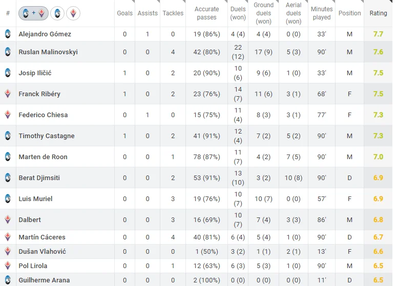 Маліновський став найгострішим гравцем команди Гасперіні в запеклому двобої проти Рібері, К'єзи і компанії. Як і прогнозувала авторитетна Gazetta dello Sport, Руслан нарешті дебютував в основі Аталанти. За версією Sofascore йому не було рівних серед тих, хто грав у стартовому складі обох команд – з найвищою у сезоні оцінкою (7,6). Лише партнер Алехандо Гомес, який вийшов на 57-й хвилині та віддав гольовий пас, отримав вищий бал (7,7). Український хавбек вийшов у центрі поля, поки Джан П'єро Гасперіні надав відпочинок Ілічічу та Гомесу в рамках обіцяної ротації після провалу бергамаскі в Лізі чемпіонів.