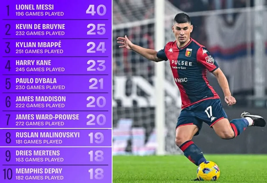 Лідером рейтингу став Ліонель Мессі, на рахунку якого 40 точних ударів здалеку. Аргентинець більше не зможе поліпшити свій показник у топ-5 лігах, адже нині виступає за Інтер Маямі.