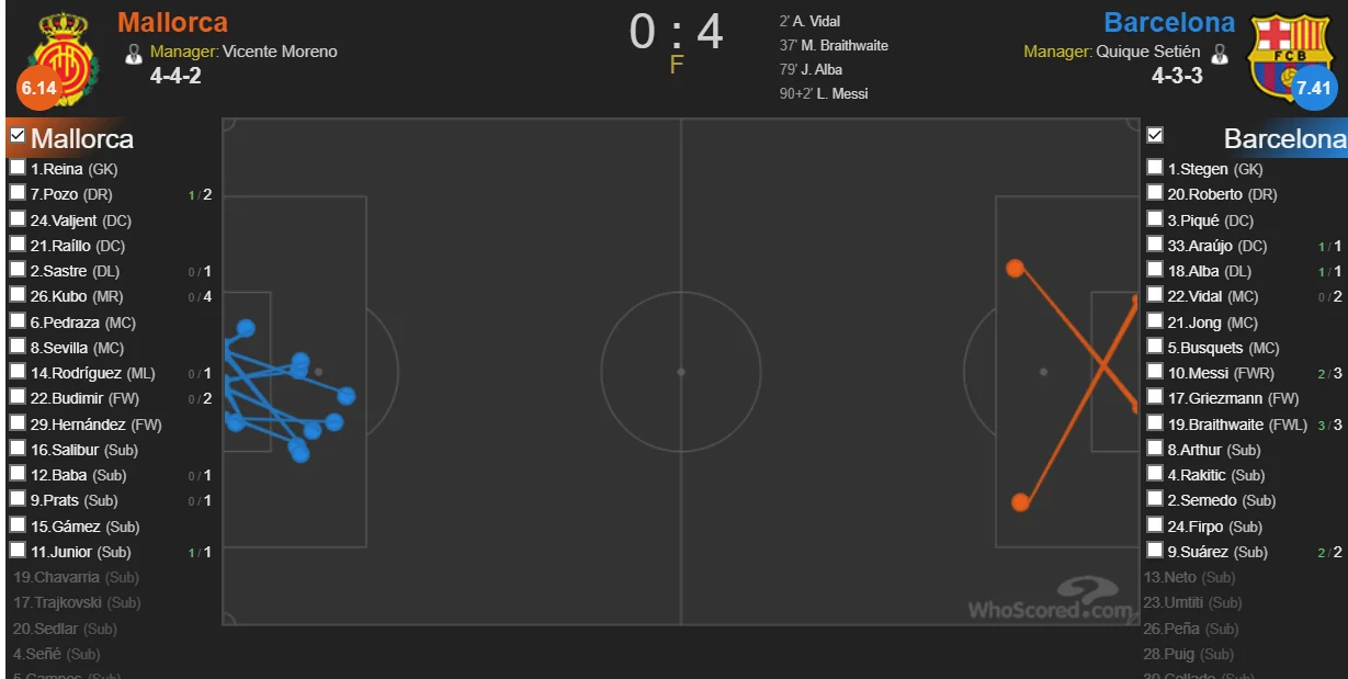 Барса винесла суперника, граючи в неймовірно впевнений футбол: 65% володіння м'ячем, 89% точності передач, 19:8 за проникними пасами, всі 12 ударів – з меж штрафного, перевага в інтенсивності пресингу – в 2,5 рази, 64:31 за виграними єдиноборствами, 21:9 – за верховими. Ну, і про чотири хороших голи з відкриттям рахунку на 65-й секунді (+стійка) не варто забивати. Каталонці повністю контролювали темп і хід поєдинку, не дозволяючи Мальорці перехоплювати ініціативу й створювати якісні моменти з гри.