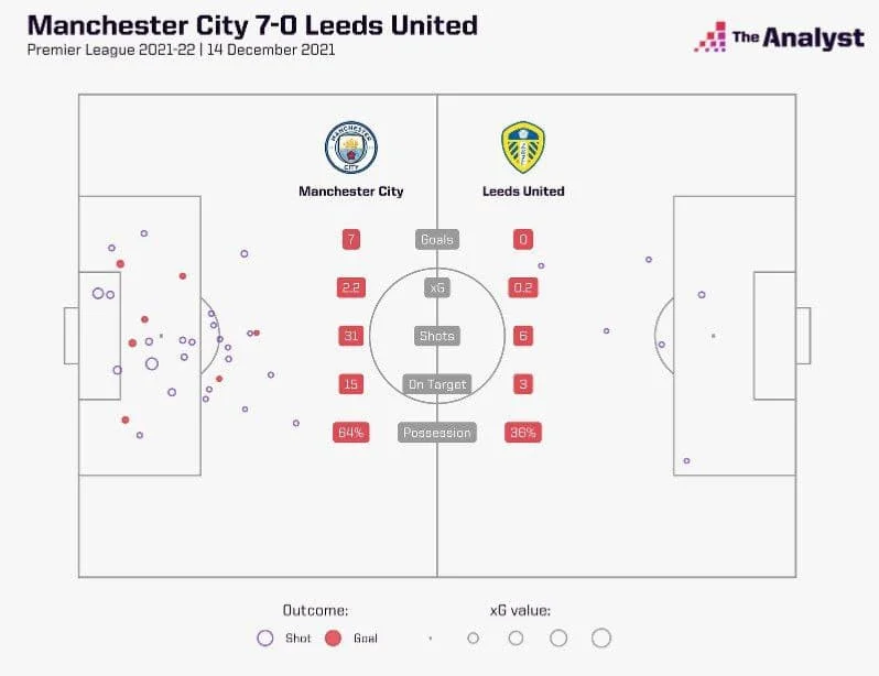 Сьогодні Сіті мав би вигравати з двозначною кількістю голів. Мав рацію аналітик The Athletic Сем Лі, який перед грою прогнозував велике шоу з повною торбою голів. Манчестерців прорвало, вони довго йшли до цього результату. Але все ще не забили і половини своїх шансів. Аж 3 явні гольові моменти таки запороли. Їхнє домінування у центрі, на флангах та стандартах просто лякає. І так, Лідс був без опорника збірної Англії Калвіна Філліпса, а це половина команди, не менше.