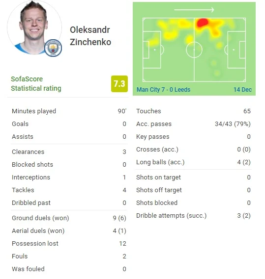 Зіна і на чужій половині став таким собі містером "початок і розвиток результативної атаки", доклавши руку до парочки голів своєї команди. Фактично сховав до кишені визнаного майстра Рафінью (0 вдалих дій зіркового бразильця на загострення під щільною опікою нашого хлопця), хоча в епізоді з рукою все ж дав маху і міг отримати дуже суворе покарання. На протилежному фланзі Харрісон і то більше проблем завдав Стоунзу. Історична розгромна перемога, яка допомогла Ман Сіті повторити рекорд Ліверпуля (33 перемоги в елітному англійському дивізіоні за 1 календарний рік).