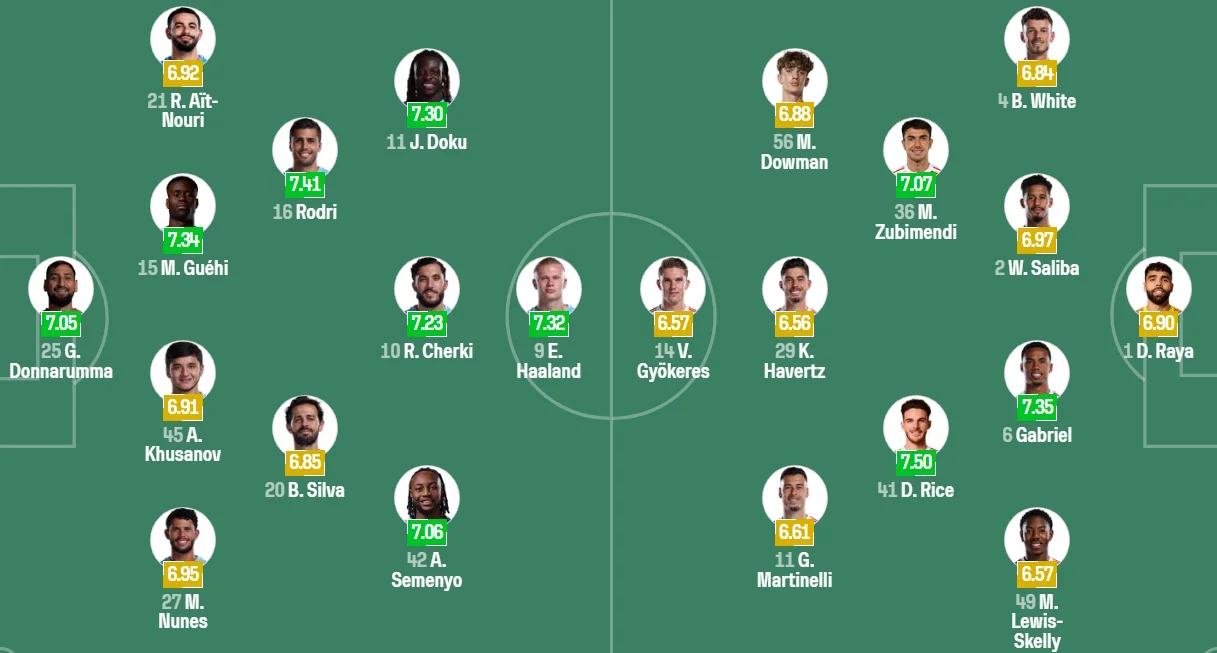Манчестер Сіті: Доннарумма – Нуньєш, Хусанов, Гехі, Аїт-Нурі – Б. Сілва, Родрі, Шеркі – Доку, Холанд, Семеньо