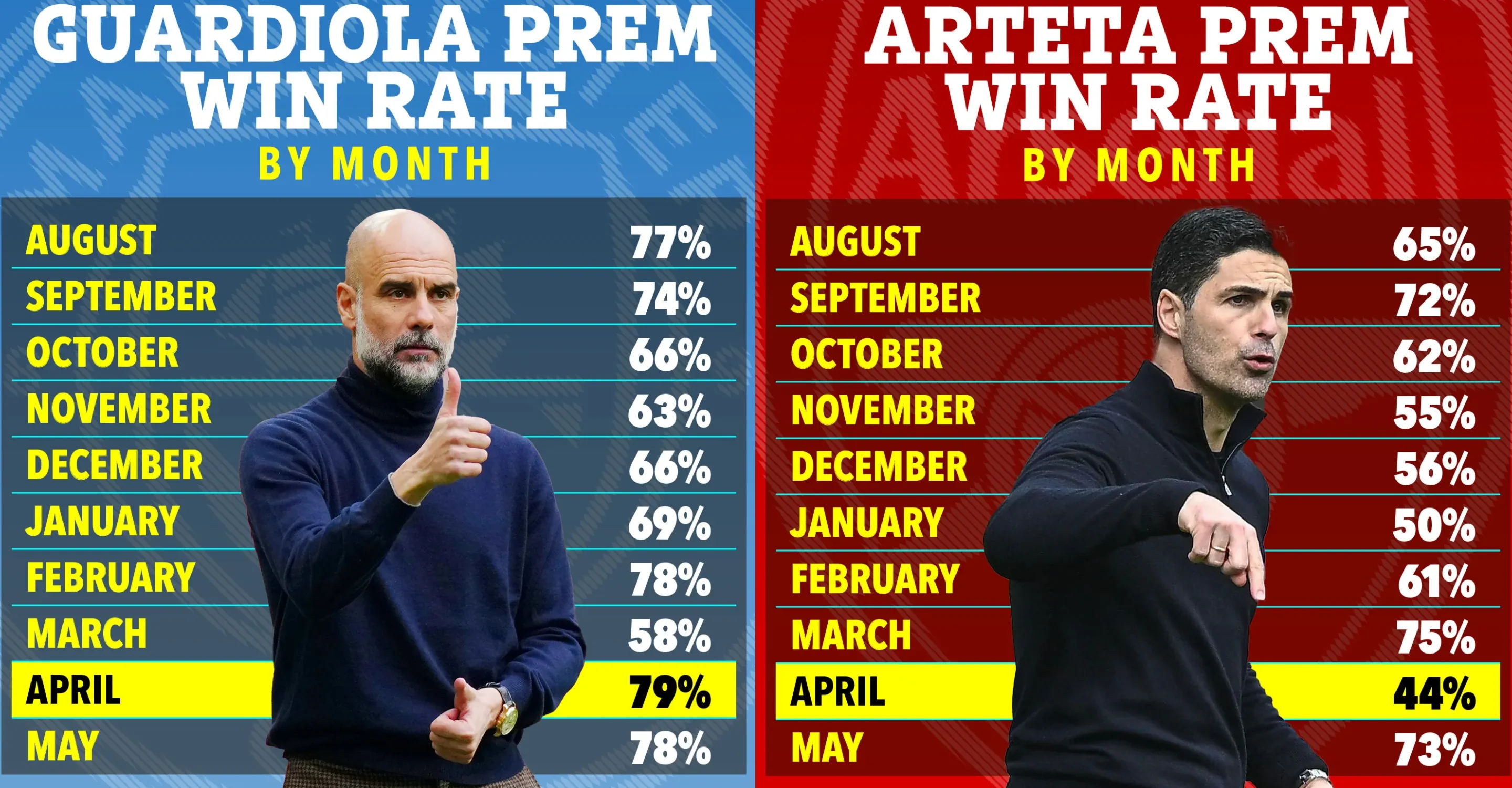 І це не дивує. Арсенал і Манчестер Сіті демонструють діаметрально протилежні результати у квітні. Вінрейт Пепа Гвардіоли у цьому становить 79%, тоді як Артета перемагав тільки в 44% квітневих матчів.