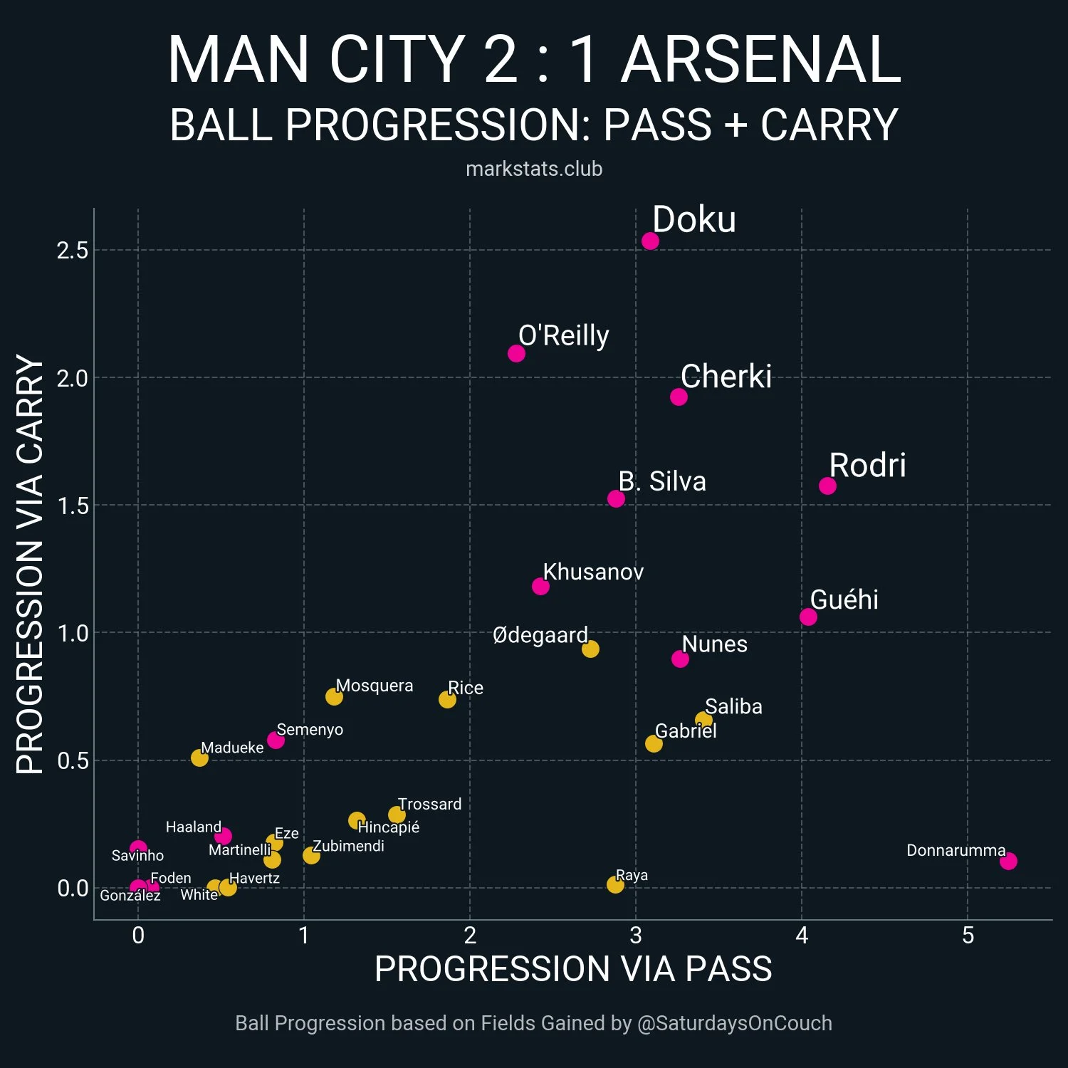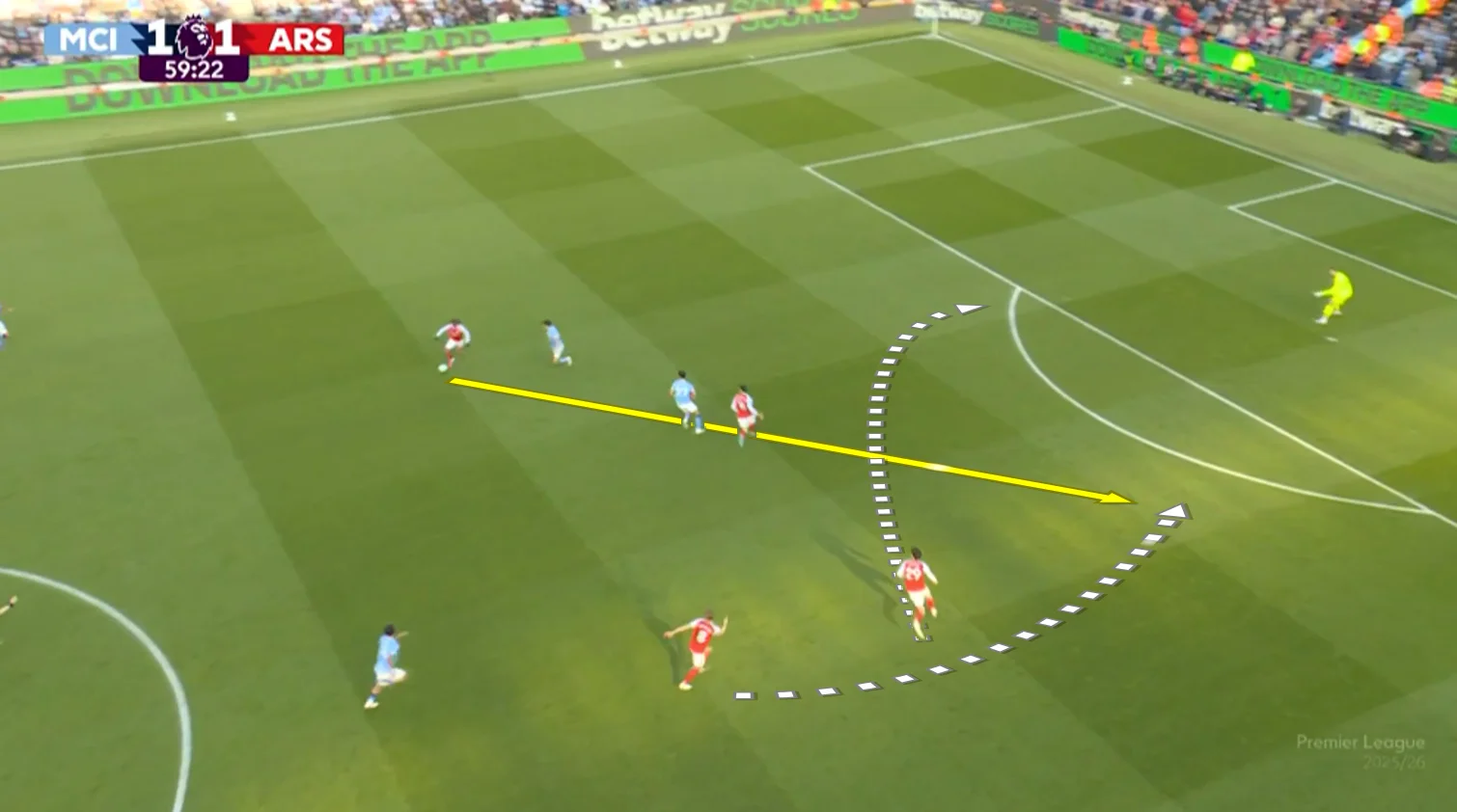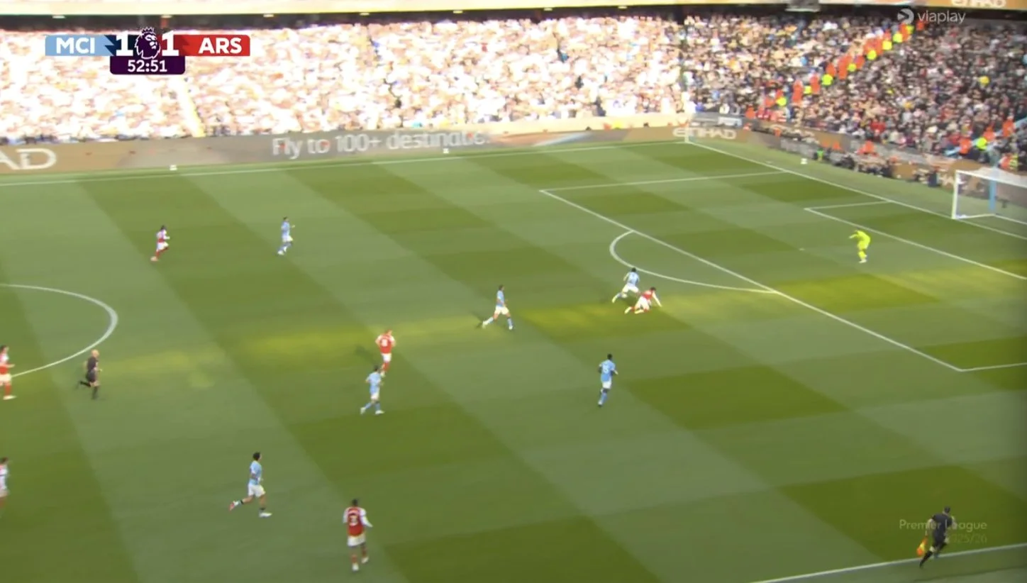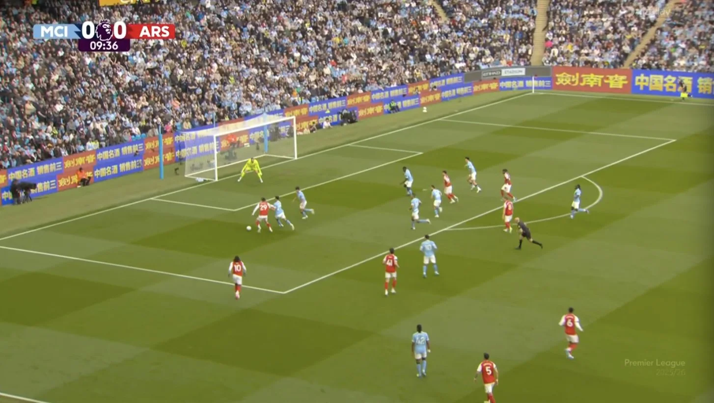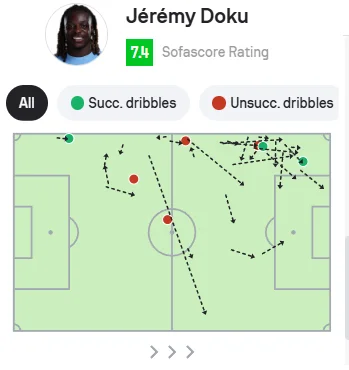 Доку опинився у зручних умовах, граючи проти резервіста Москери. На цьому фланзі завжди було тривожно. Навіть якщо не вдавалося обігрувати, то бельгієць стягував на себе 2-3 футболістів – тим не менш, Арсенал у першому таймі відбився. Та й загалом Жеремі мав лишень три успішні спроби обіграшу 1-в-1 із семи.