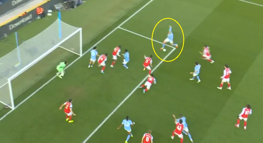 Третій стовп – зональний пресинг у схемі 4-2-4, який Сіті вже використовував під час свого походу до фіналу ЛЧ-2023. Він став приноси дивіденди після 25-ї хвилини, змусивши Арсенал сідати в перманентний низький блок. Цьому сприяв і дуже інтенсивний контрпресинг.