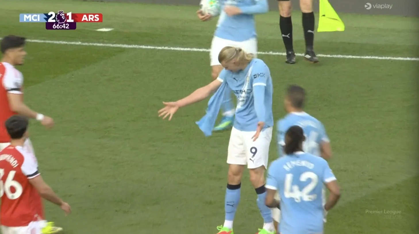 Другий тайм, здавалося б, продовжив тенденції першого. Ман Сіті знову насів і ледь не забив швидкий гол з кутового – Бернарду Сілва в черговий раз закрутив у ворота, а Райя парирував перед собою. Хусанов видряпав м'яч і добив у захисника, а Холанд зачепився за відскок та вгатив з правого кута воротарського. Стійка врятувала Арсенал!