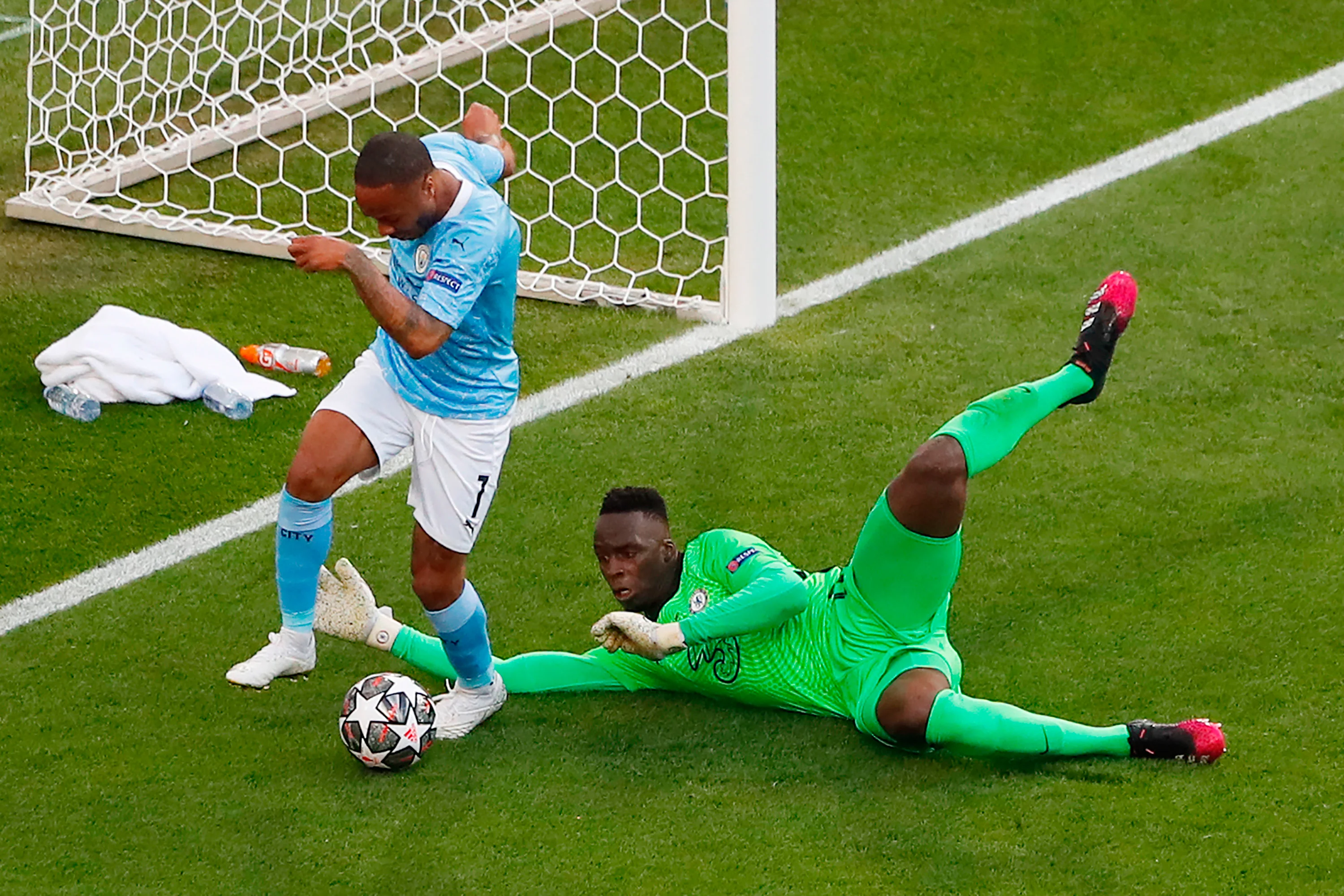Від цьогорічного фіналу очікували максимально закритої гри із контратаками Челсі. З другим пунктом прогнозисти вгадали, а от агресивний футбол від Ман Сіті здивував – “містяни” з перших хвилин спробували захопити контроль над м’ячем, а вже на 8-й вони могли вийти вперед внаслідок фірмового пасу від Едерсона. Стерлінг підхопив його й вийшов віч-на-віч з Менді, однак технічний брак завадив Рахіму переграти Едуара з першої спроби. Вінгер загнав себе в глухий кут і пробив п’яткою повз ворота.