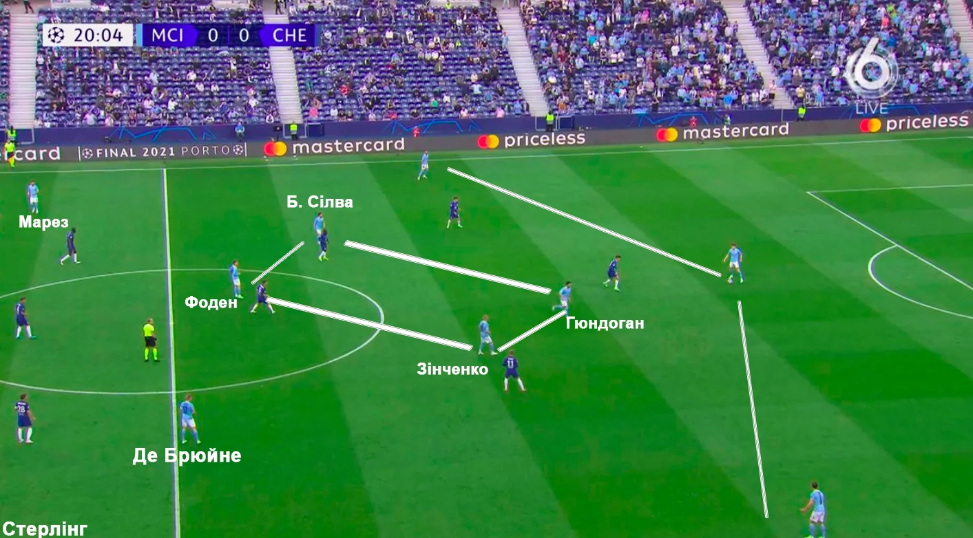 При цьому на стадії розіграшу м'яча команда вибудовувалась трійкою захисників з "ромбом" у центрі, де Гюндоган грав знизу – Зінченко й Бернарду Сілва, своєю чергою, зміщувались у центр. Після переведення м'яча в цю зону Олександр старався відійти на фланг, ускладнюючи систему опіки з боку Челсі.
