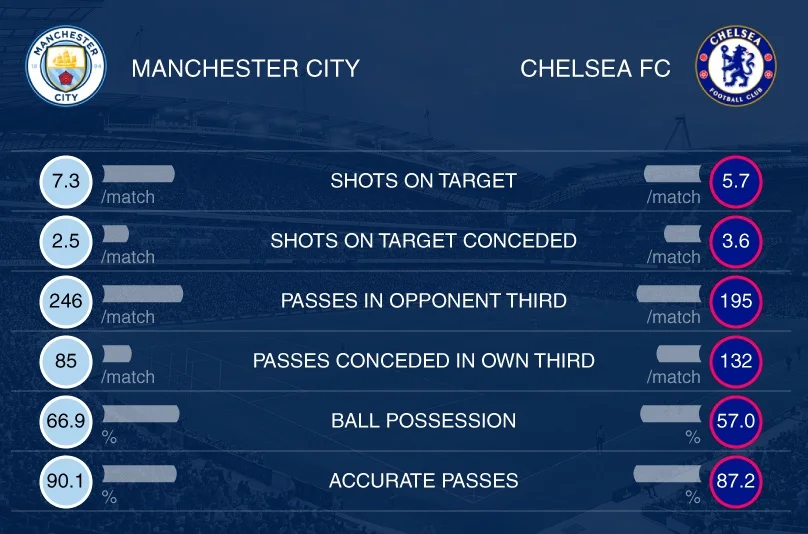 Манчестер Сіті менше зачепила хвиля коронавірусу, що однозначно дало перевагу. Але команда Зінченка все одно демонструє найстабільніший футбол. Сіті по сезону переважає Челсі за всіма показниками – як атакувальними, так і захисними.