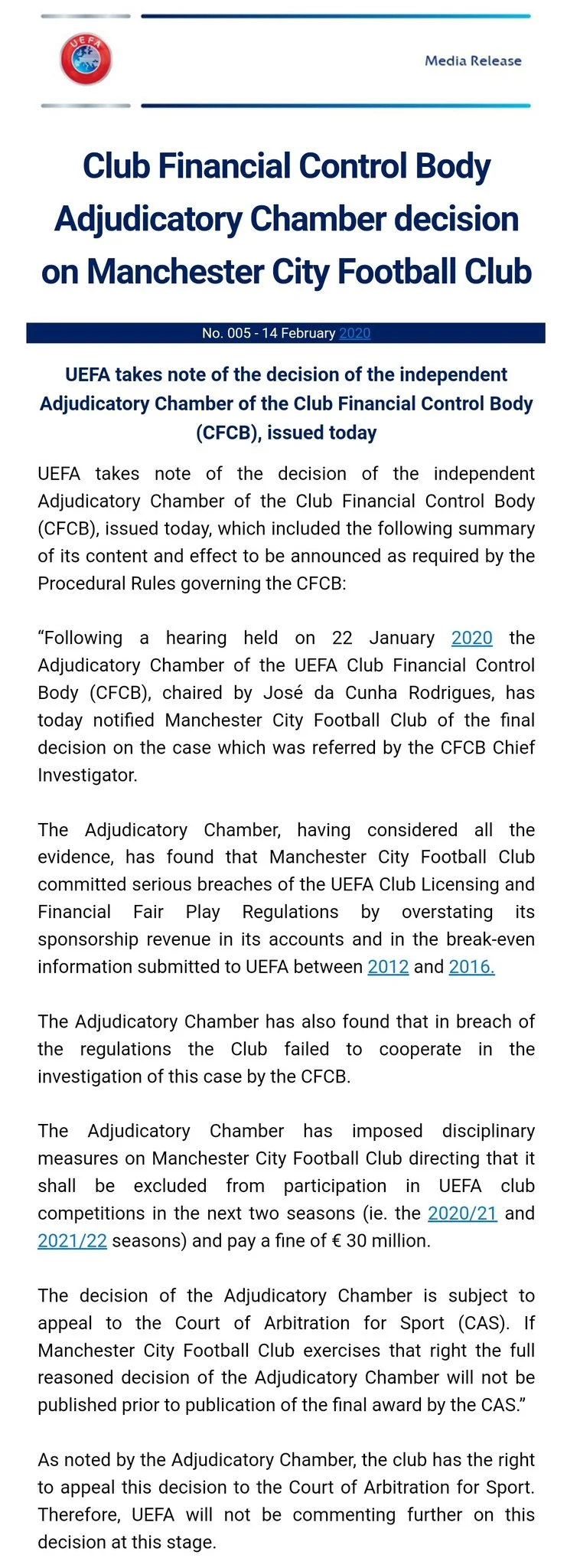 Таким чином "містяни" не зіграють в головному європейському клубному турнірі в наступних двох сезонах. Відзначимо, що це рішення може бути оскаржене в спортивному арбітражному суді (CAS).