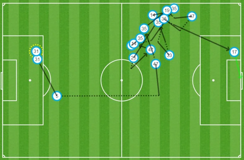 Зінченко взяв активну участь в першому результативному наступі "містян", коли вони відкрили рахунок у зустрічі на 6-й хвилині. Перш ніж Емерік Ляпорт розкішним пасом знайшов у вільній зоні Кевін де Брюйне, а бельгієць з гострого кута загнав м'яч у сітку, Олександр (35-й номер) виконав 5 підготовчих передач у цій атаці, зокрема й передгольову на Ляпорта.