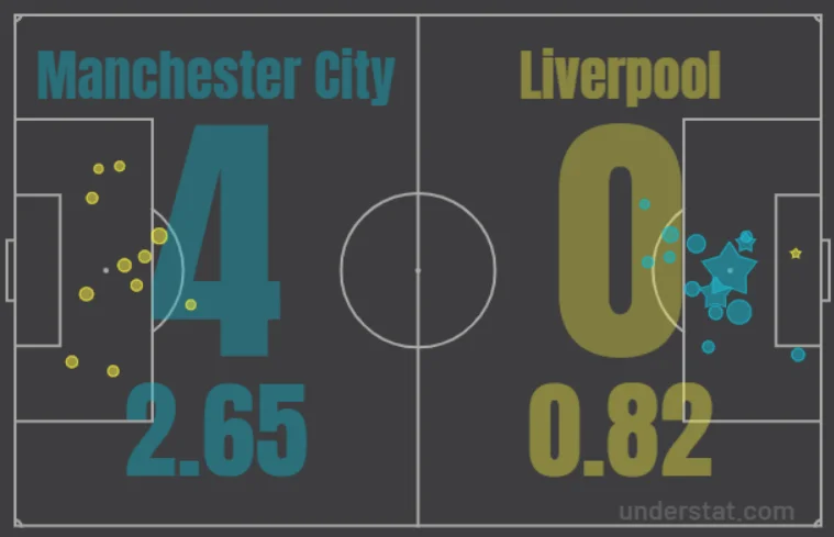 Мерсисайдці не так вже й сильно програвали по грі. Вони старалися високо накривати Сіті й продемонстрували вдвічі вищу інтенсивність пресингу, а також не сильно відстали по ударах – 14:12 загалом, 6:3 в площину плюс стійка, 10:9 з меж штрафного. За проникними передачами Ліверпуль так і зовсім попереду (11:7), але "червоні" сильно просіли в гостроті. Різниця за очікуваними голами просто колосальна.