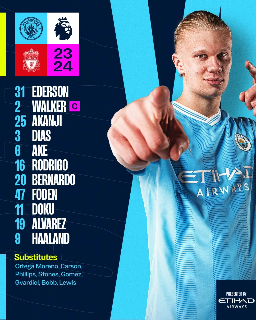 Стартовий склад Ман Сіті: Едерсон – Вокер, Аканджі, Діаш, Аке – Бернарду, Родрі, Фоден – Альварес, Холанд, Доку.