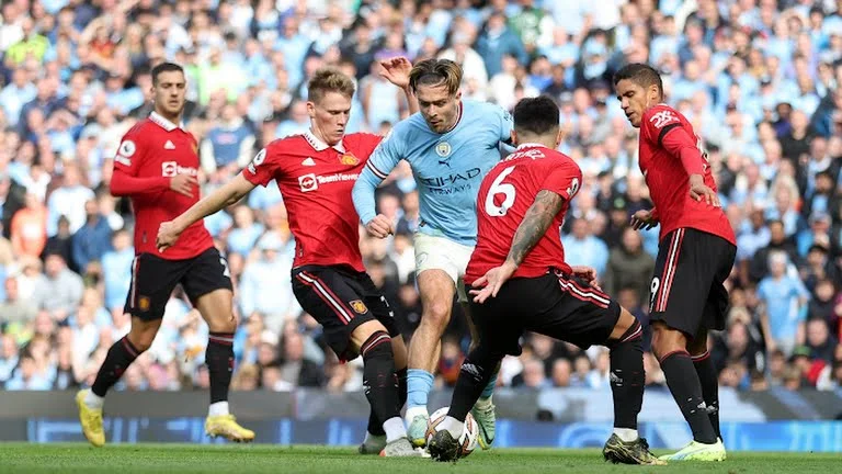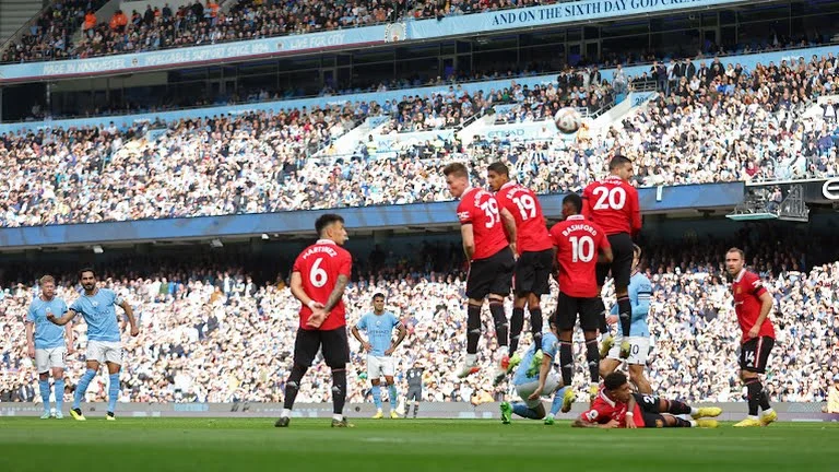 Не минуло й 10 хвилин, як Сіті змітає МЮ: 75% володіння, 4:0 удари (всі з меж штрафного). Перший постріл "дияволів" – як їхня гра на старті дербі. Лише завдяки промаху Аканджі дальній пас дійшов до Санчо, той прострілив, а Еріксен лише слабко покотив в руки Едерсону, думаючи більше про те, як не впасти, ніж акцентовано пробити. Гріліш учергове знущається над суперниками. Лісандро Мартінес змушений приймати на стегно біля свого штрафного. Стандарт ефектно виконав Гюндоган – стійка рятує Де Хеа.