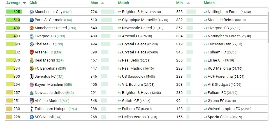 Найдорожчим стартовим складом володіє Манчестер Сіті (середня вартість – 605 мільйонів євро), який посідає 2 місце в АПЛ, поступаючись лише Арсеналу. Другим у рейтингу іде ПСЖ (510 млн), топ-3 замкнув Манчестер Юнайтед (480 мільйонів).
