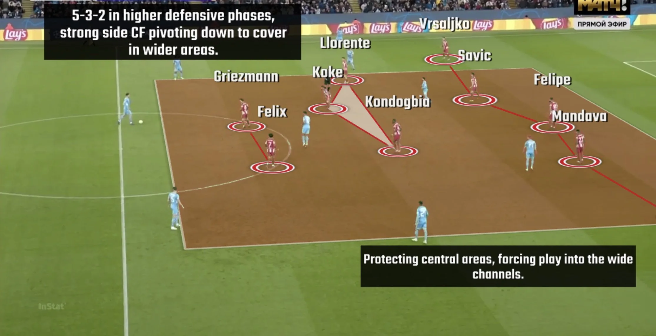 В теорії, стартовий план Гвардіоли виглядав дуже цікаво, однак на практиці все почало розбиватись об компактний блок Атлетіко в схемі 5-3-2 / 5-4-1. Мадридці дисципліновано відпрацьовували позаду (навіть Феліш), не підпускаючи Манчестер Сіті на ударні позиції – як наслідок, домінування "містян" у роботі з м'ячем в першому таймі виявилось стерильним.