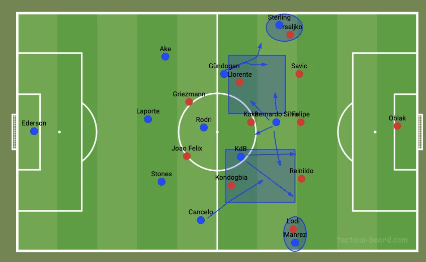 "Містяни" ж у роздягальні явно зробили висновки. Стерлінг став активніше зміщуватись з флангу в центр, обігруючись з Гюндоганом в районі лінії карного майданчика, та і Де Брюйне став діяти вертикальніше. Такий футбол вилився у кілька неприємних для Атлетіко епізодів, але до 60-х хвилин у Манчестер Сіті був тільки один гольовий момент – це Де Брюйне зі стандарту пробив у правий нижній кут. Облак парирував.